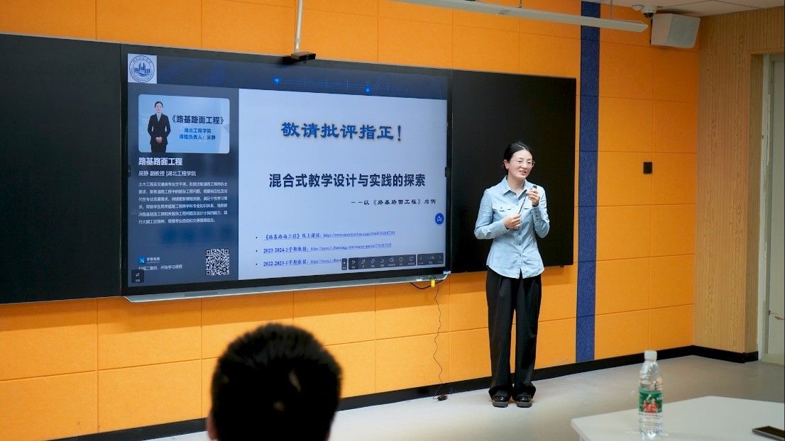 吴静老师作为省一流课程《路基路面工程》负责人,以“混合式教学设计与实践的探索”为主题,结合专业认证内在逻辑及省一流课程建设历程,分享了在课程分析、教学设计、教学实施、创新特色及建设方向五个方面的经验。重点探讨了如何针对教学中存在的真实痛点问题,通过课程内容重构、教学方法创新和考评体系优化等方式进行教学改革与创新