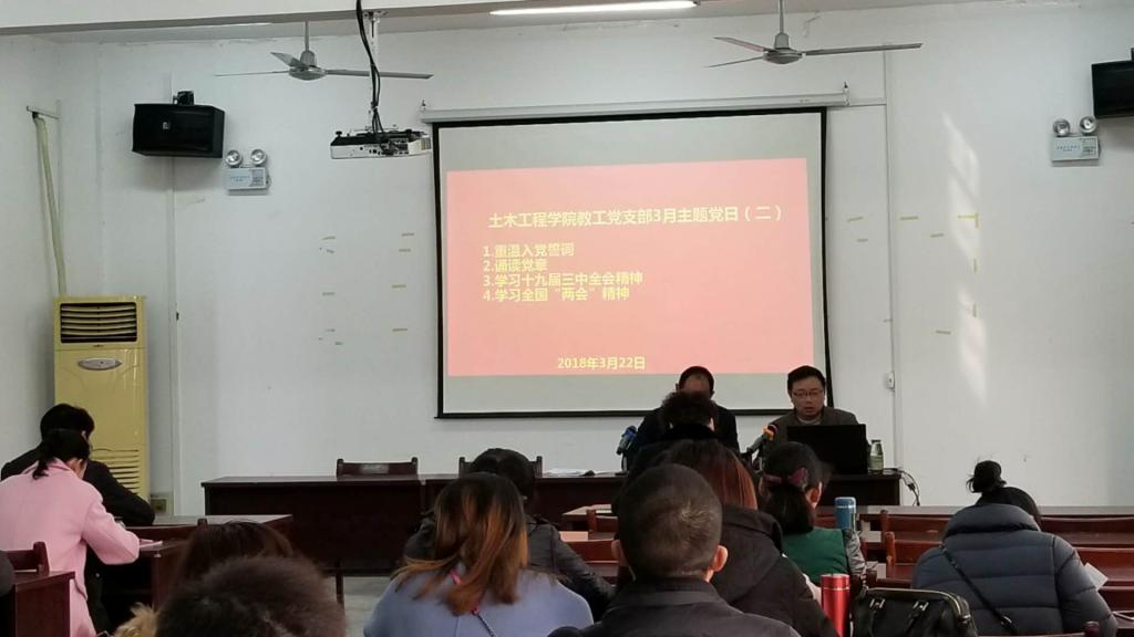 首先教工支部纪检委员夏蕊芳带领大家重温入党誓词、诵读了党章。随后支部书记陈军权带领大家认真学习了十九届三中全会公报以及2018年全国“两会”精神,尤其是对宪法修正案进行了认真学习。