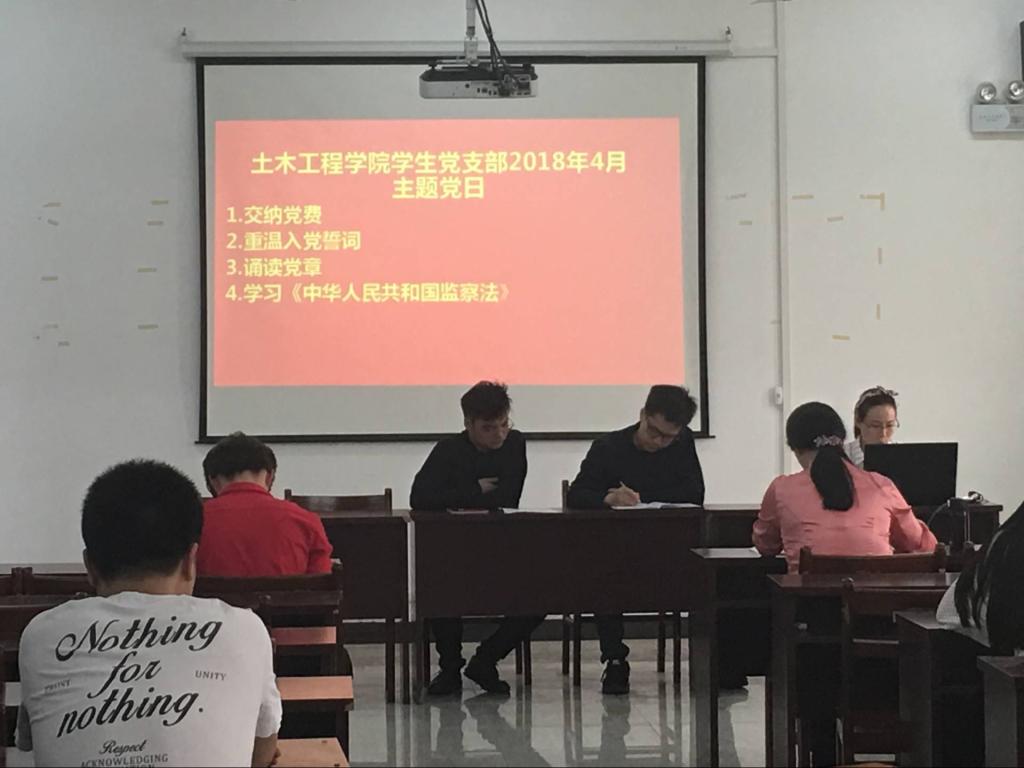 本次会议由我院学生支部纪检委员冯治主持。首先,全体党员自觉缴纳党费、重温入党誓词、集体诵读党章,随后副书记叶婵讲党课,内容是《中华人民共和国监察法》,叶婵对制定监察法的重要意义、指导思想、基本思路等方面进行了详细的讲解。最后宣传委员李超就本次主题党日提出几点要求,希望全体党员自觉准守党纪党规,坚定共产主义信仰,绝不能信仰宗教,节假日安全出行,树立理性消费观,拒绝不良校园贷,提高防范意识,拒绝传销。