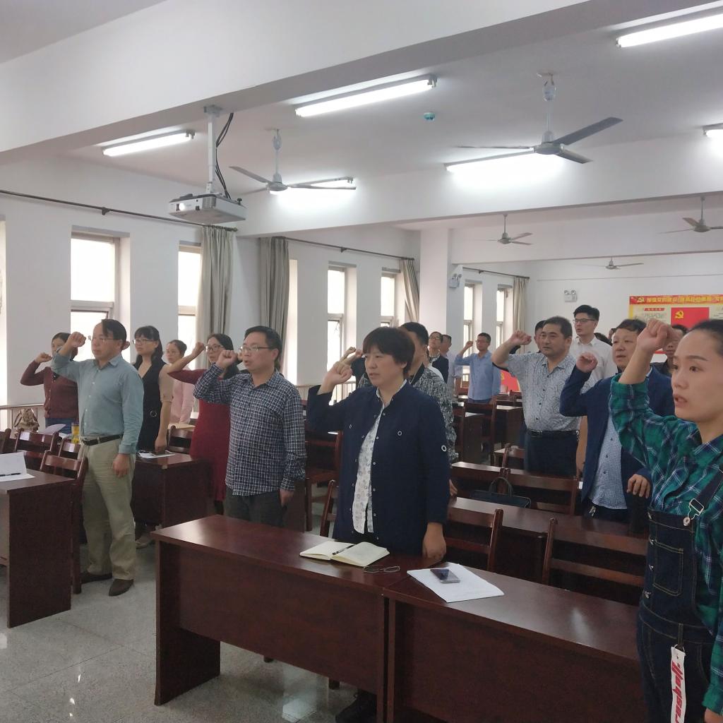 首先教工支部党员缴纳9月份党费,然后,教工支部纪检委员夏蕊芳老师带领教工党员重温了入党誓词、诵读党章。随后,教工支部副书记郭波传达学习了《习近平新时代中国特色社会主义思想三十讲》、学习贯彻习近平总书记在全国组织工作会议上的重要讲话精神和习近平总书记在全国宣传思想工作会议上的重要讲话精神。会上还学习了新修订的《中国共产党纪律处分条例》以及《中共中央关于追授郑德荣等7名同志“全国优秀共产党员”称号的决定》。