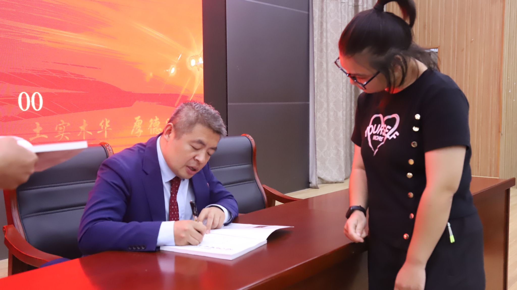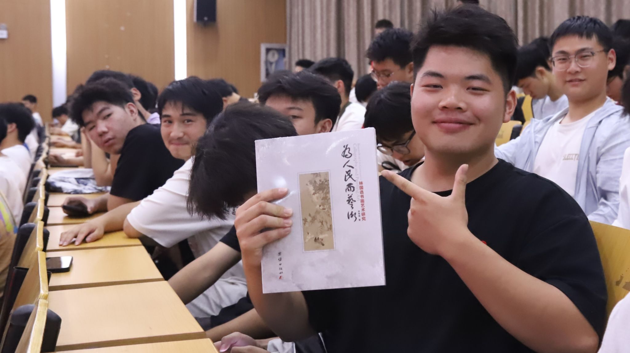在互动问答环节,现场氛围达到高潮。新生们踊跃举手,围绕“如何面对人生低谷”“大学期间是否需要考研”“如何创业”等问题向校友提问,表达了自己初入大学的困惑与期待。面对新生们的提问,校友们耐心细致地逐一解答,结合自身经历给出了针对性的建议。为进一步激励新生学习与思考,乔秀强校友向每位提问新生赠送自己撰写的书籍《为人民而艺术》,并附上个性化寄语,鼓励新生拓宽视野、深化认知。