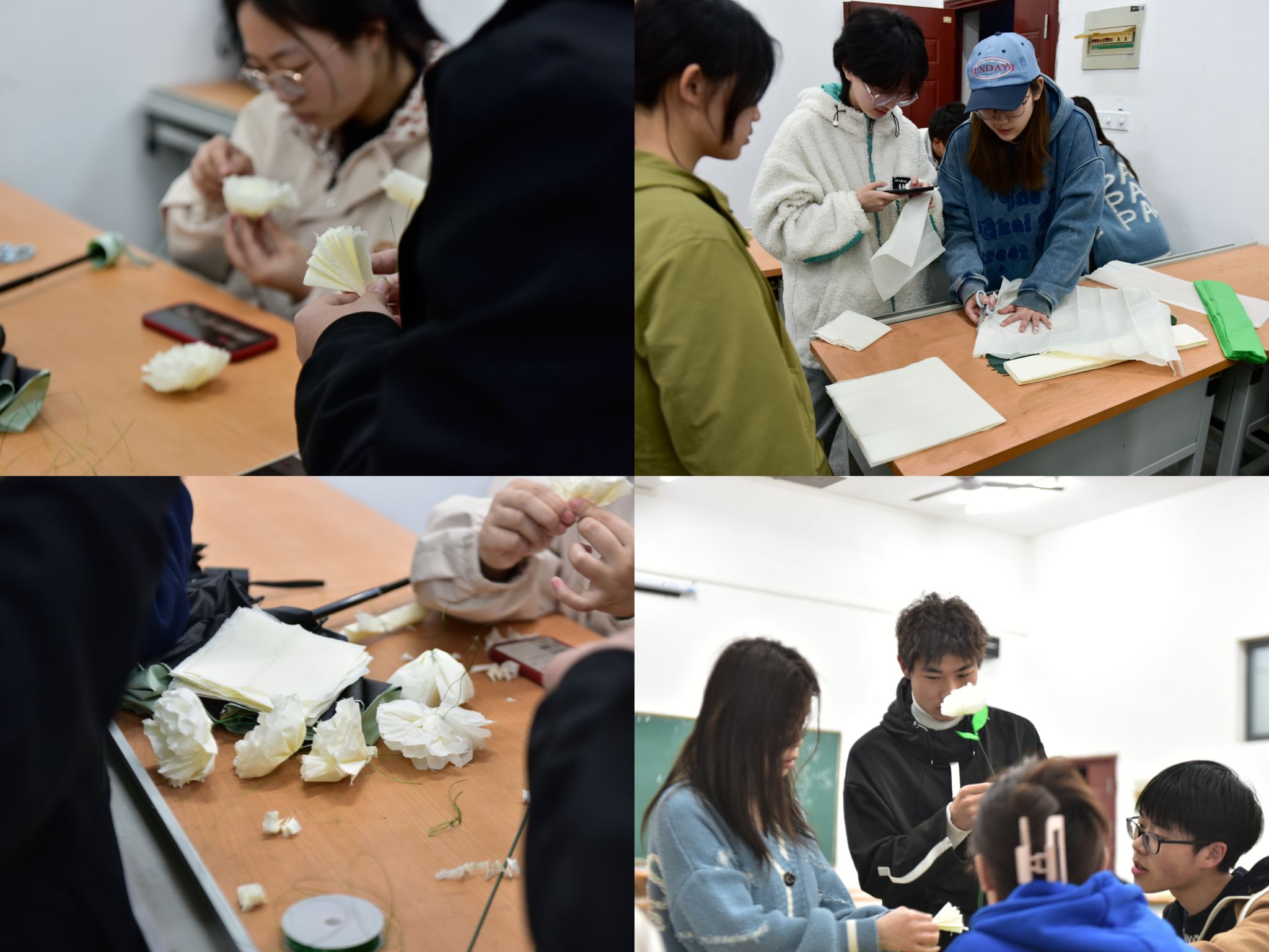 在出发之前,同学们积极地为活动做着准备,用自己亲手制作的小白菊来表达对于革命烈士的崇敬之情。