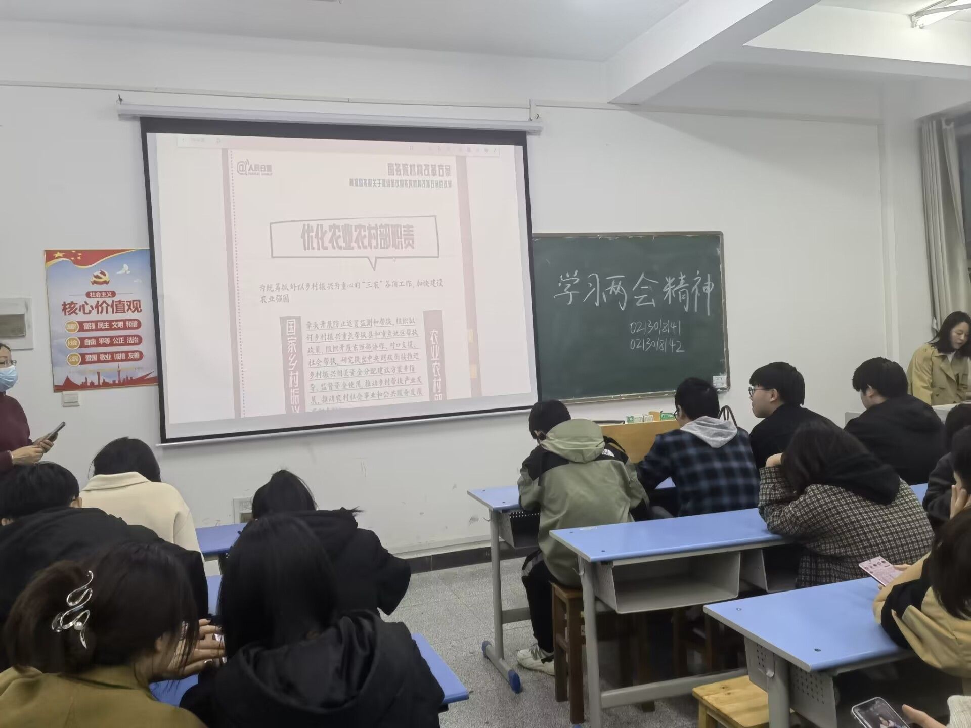 为深入贯彻落实全国两会精神,引导学生深刻领会、准确把握两会精神实质,切实增强青年学子的责任感和历史使命感。我院各班利用本周周日点评开展了以“学两会精神 践青春担当”为主题的班会活动。