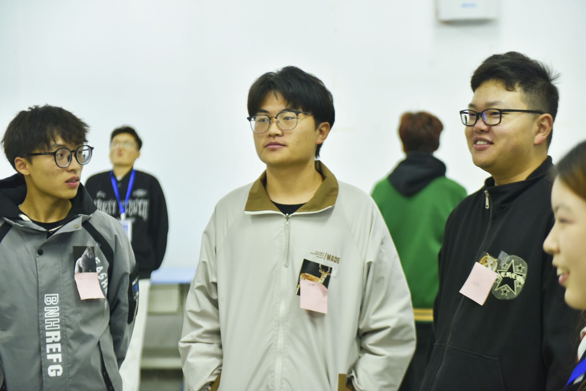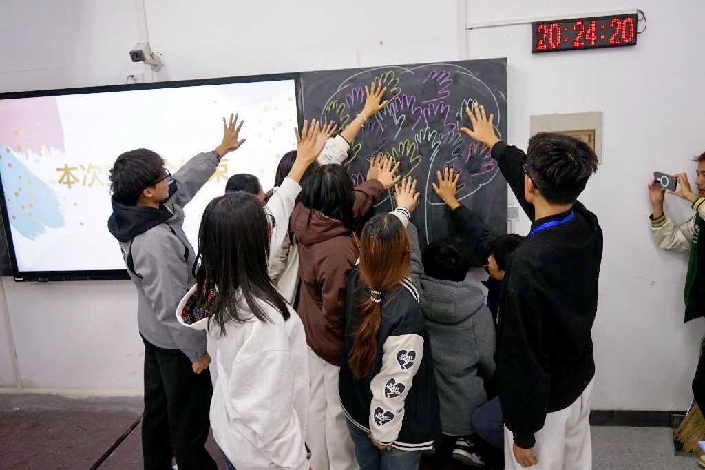 活动开始,由主持人给大家介绍此次活动的主题和开展流程。第一个游戏环节为“动物连连蹲“,同学们在便利贴上写下姓名,并依次上台将其贴在黑板中自己喜爱的小动物图片上。随后,工作人员将动物图片分发至每位参与者手中,大家将图片贴于胸口,共同参与了“动物连连蹲”的趣味小游戏。第二个游戏环节为”趣味桥梁——请与我击掌“,同学们逐一上台,在黑板上的大树图案中用粉笔描绘出自己的手掌印,寓意着大家是一个大家庭,团结互助是主旋律,共同促进彼此的成长与进步。这一环节不仅加深了同学们之间的友谊,还让大家在轻松愉快的氛围中相互熟悉。