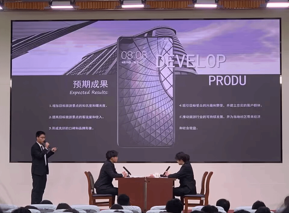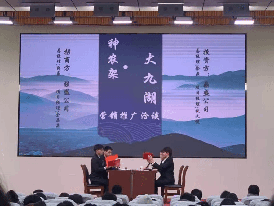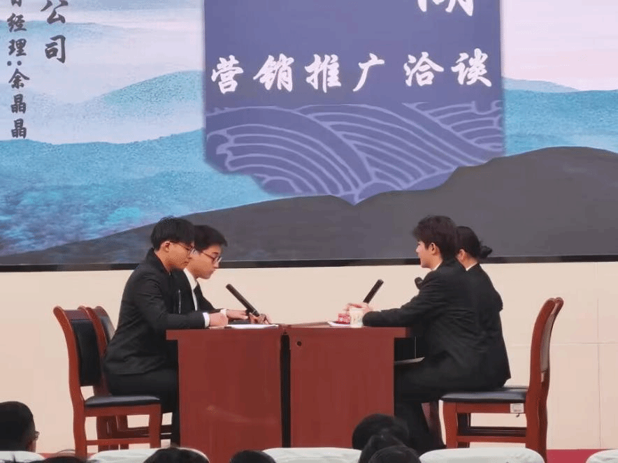 在比赛中,我院扶文健和徐鼎同学与经管学院同学模拟商务谈判,作为某公司来对某地区的景区招商投资洽谈。他们站姿、握手方式、面部表情等细节的掌控,表达了对对方的尊重。合适的礼貌和行为建立起良好的形象。