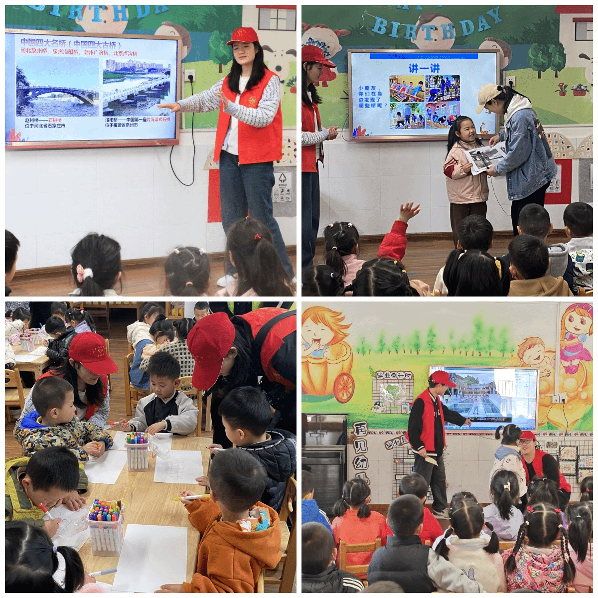 “一道长虹落江面,人来车往很方便;不怕风吹和雨打,交通运输做贡献。小朋友们请你们猜一猜,这说的是什么呀?”。伴随着“小老师”的谜语游戏开场,小朋友们开始了一场愉快的桥梁探索之旅。“小老师”首先从中国古代四大名桥出发,用通俗易懂的语言,给孩子们介绍了中国桥梁发展历史,并围绕桥梁取材、用途、分布、构造等方面,讲解了桥梁知识,如拱桥、悬索桥、斜拉桥等造型特点和承重原理,在力与美的交融辉映下,小朋友对中国桥梁文化与伟大成就有了全面立体的感性认识。一张张精美的桥梁图片,一串串有趣的小小问题,引得孩子们热情高涨、兴奋不已,争先恐后举手回答,现场气氛十分热烈。
