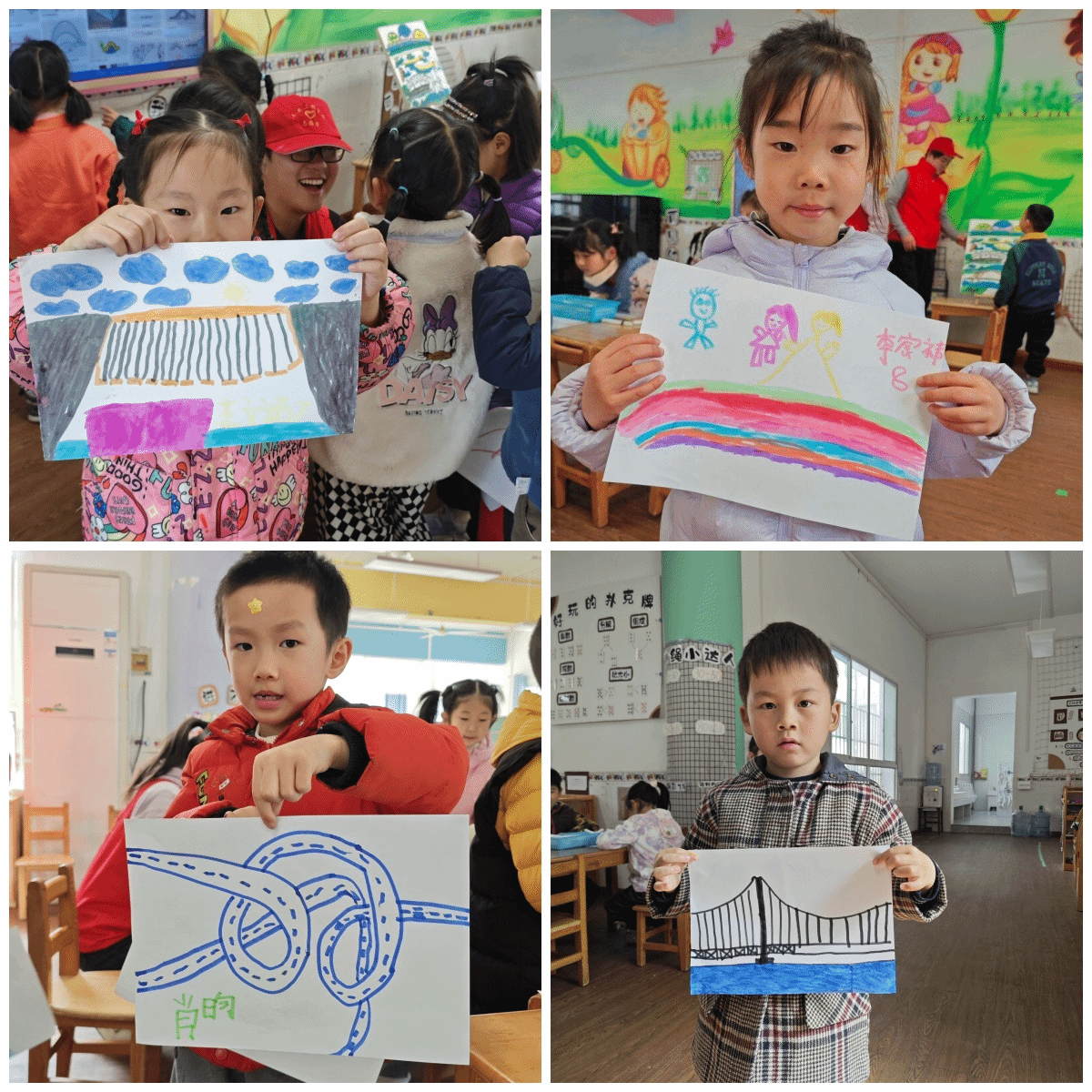 在“小老师”一番生动的讲解后,小朋友纷纷拿出提前准备好的生活中与桥的合影,介绍自己与桥的故事。随后,小朋友们五五分组,动手设计涂鸦心中的桥,在绘画中感知桥梁之美。“我要搭个长长的、高高的、超大超大的跨海大桥”,带着自己设计好的图纸,孩子们纷纷变身小建筑师,在大哥哥大姐姐的帮助下,三五成群搭建起形式各异的小桥来。大家开动脑筋,发挥想象,共商建构方法,在动手过程中,孩子们体验到了求知、探索、分享的快乐。 看着自己动手搭建的桥梁作品,小建筑师们抑制不住的开心和骄傲。