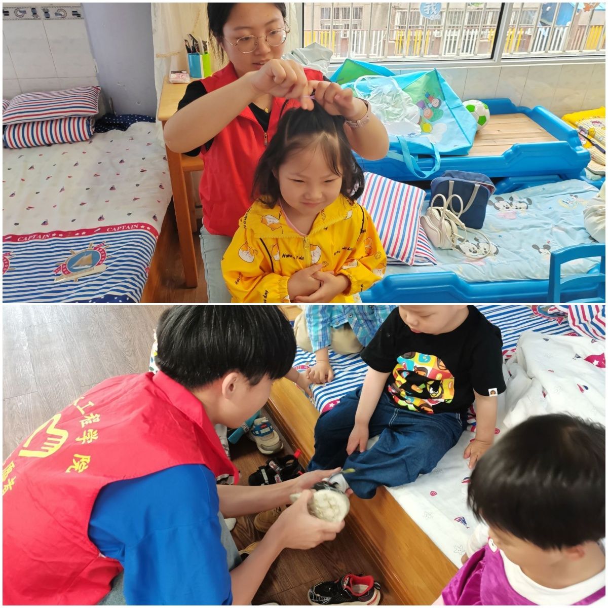 “哥哥姐姐,你们陪我们玩,给我穿衣服,好像我们的爸爸妈妈啊”,这是一场关于母爱的双向奔赴,不仅小朋友们感受到了伟大的母爱,大朋友们也体验了一番当母亲的角色。小朋友们午睡起床后,志愿者们耐心地为孩子们梳理辫子,穿衣穿鞋,整理玩具,给孩子们讲绘本故事,做游戏,在陪伴中他们不仅学到了许多实用的亲子教育和护理知识,还亲身体验了作为母亲和一名保教老师的艰辛与快乐。