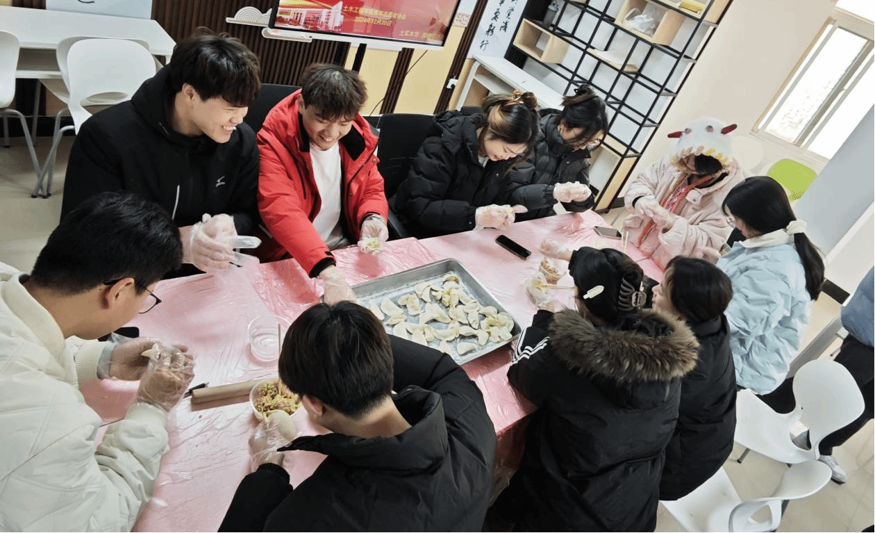 活动现场热闹非凡,师生们积极参与,大家五人一组,纷纷动手比赛包饺子,共同体验传统节日的氛围和包饺子劳动的乐趣,场面温馨而欢乐。一个个饱满圆润的饺子在同学们手上逐渐成型,或似月牙,或如元宝,整齐地摆放在一起。在包饺子之余,同学们与辅导员汪颖老师、尹驰老师畅谈未来,探讨如何更有意义地度过即将来临的寒假以及自己的未来规划。老师们鼓励大家一步一个脚印,朝着自己的理想和目标努力前行。同学们还在贺卡上相互写下祝福语,那些字里行间真挚的话语,如一股暖流,温暖着同学们彼此的心田。