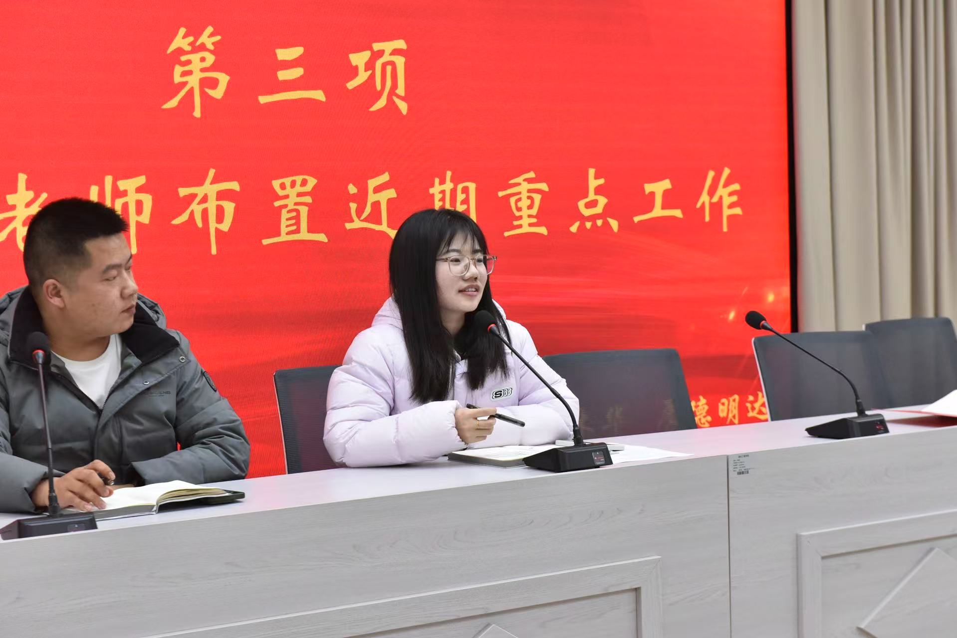 会议伊始,5名学生干部代表对自己2024年秋季学期的学生会工作进行了回顾和盘点,同时对于新学期的工作安排进行了展望。随后,学生会主席团成员对前期工作进行总结汇报,对近期重点工作进行梳理。各辅导员老师就接下来学院的各项活动安排以及后期有关工作进行了相应部署。