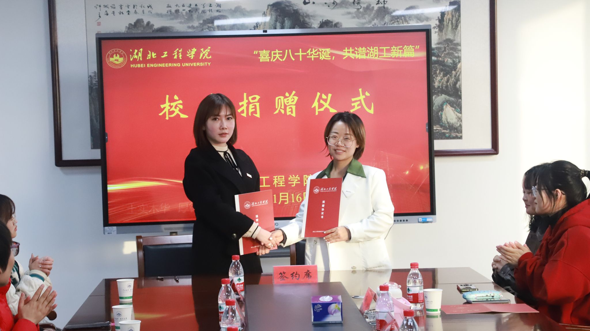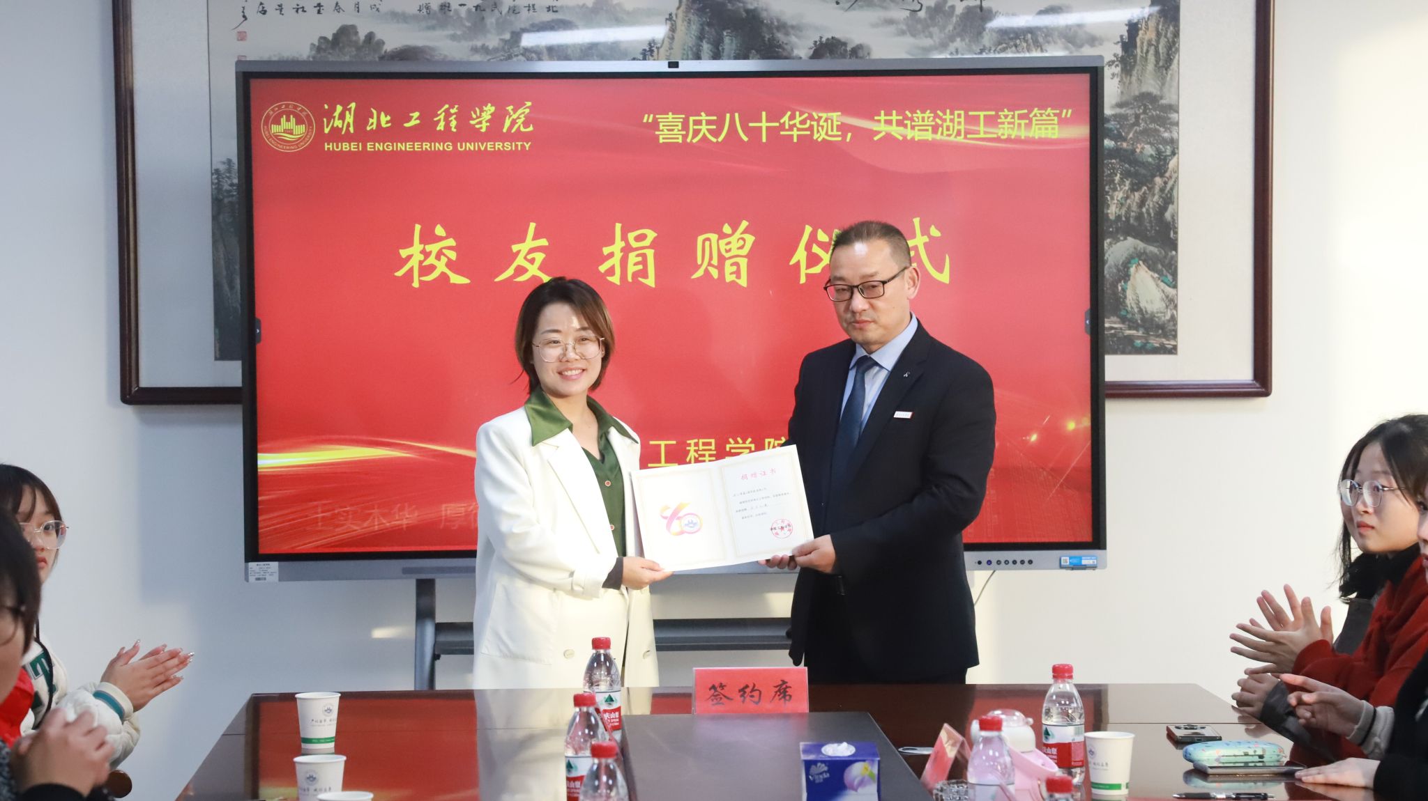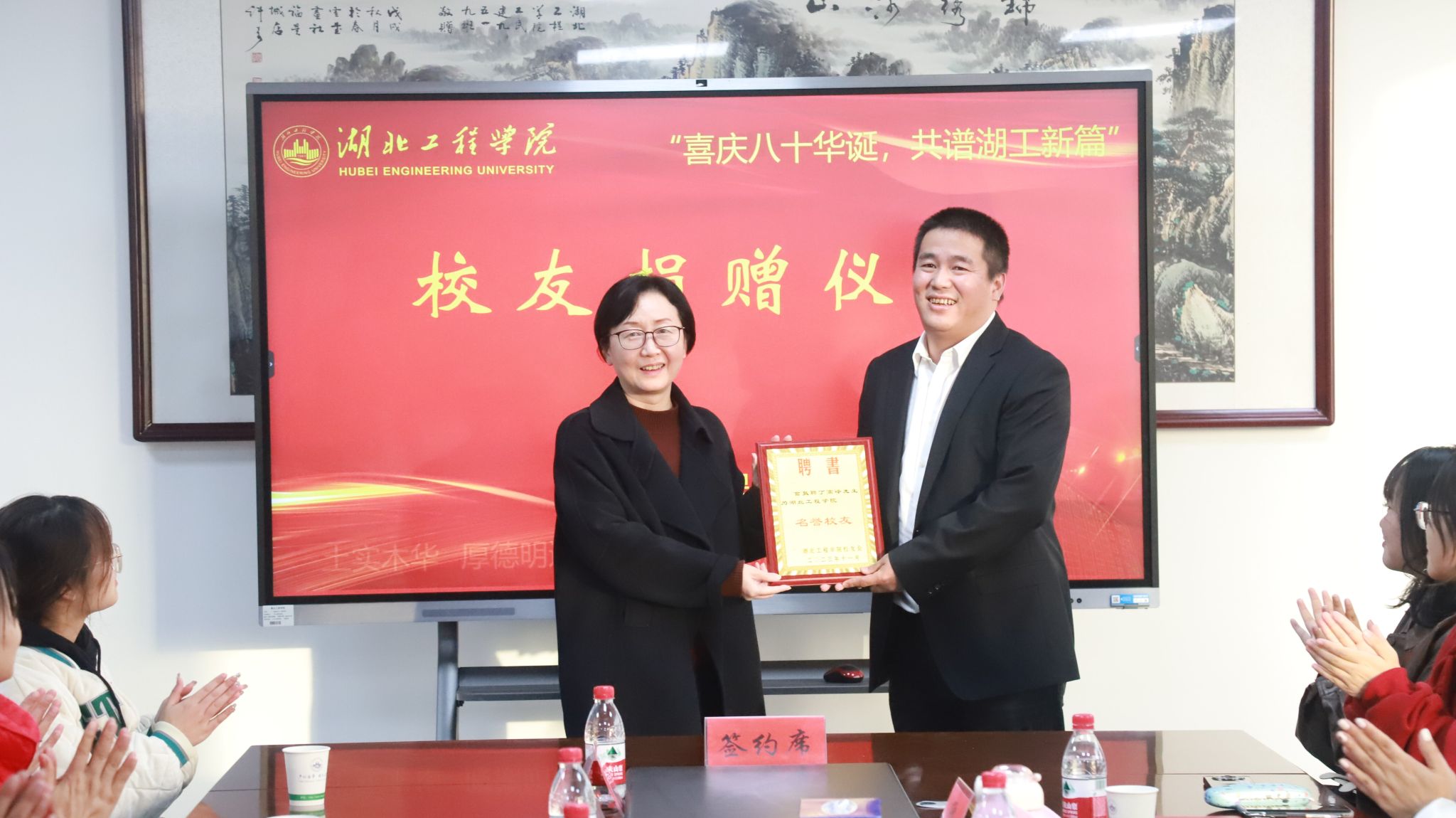 捐赠仪式上,党委常委、纪委书记、监察专员邹虹代表学校向丁高峰董事长颁发名誉校友聘书。学校教育发展基金会秘书长刘艳芬代表学校与校友胡艳平签订捐赠协议,校友办副主任胡福德为其颁发捐赠证书。