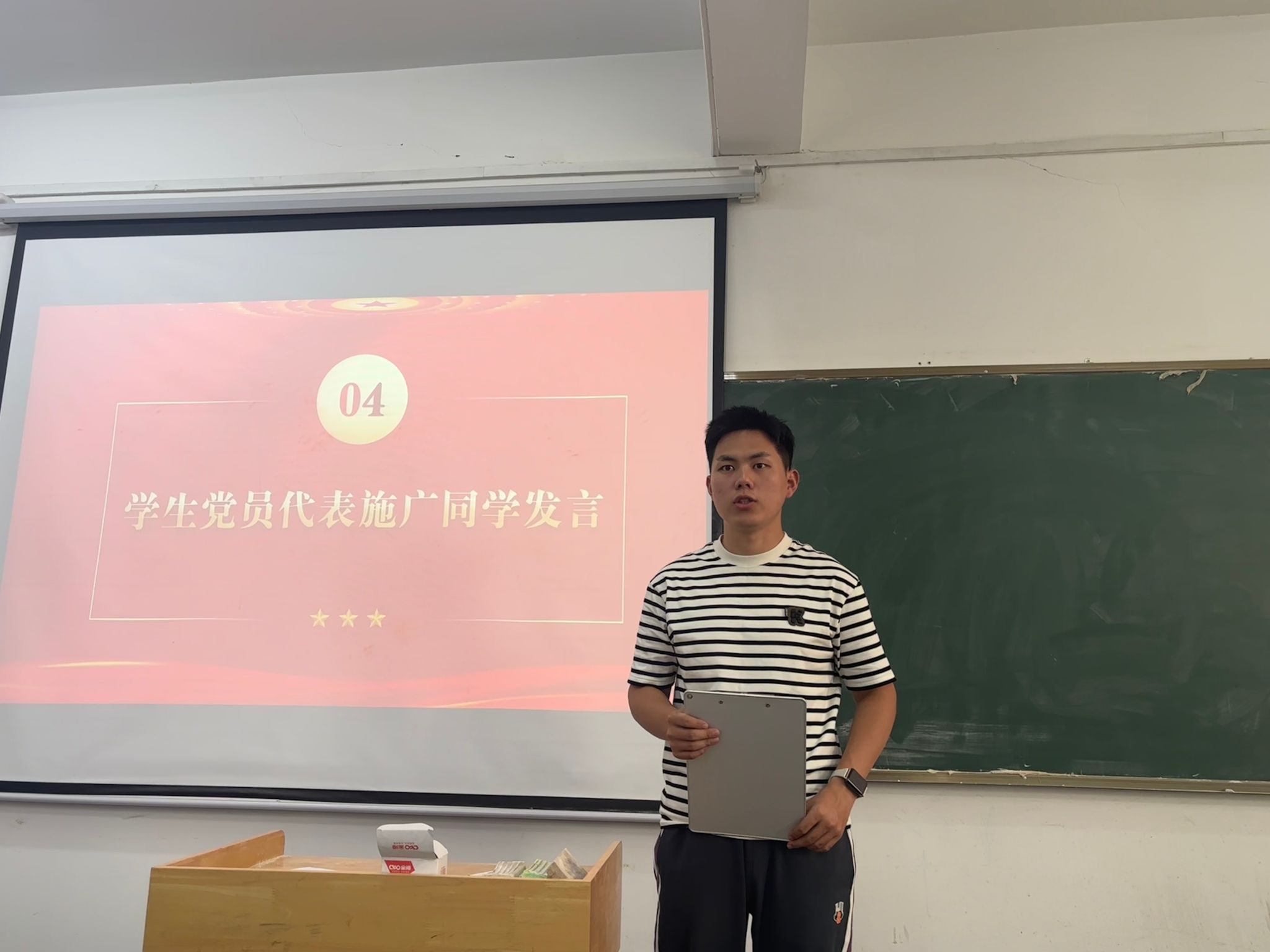 学生第三党支部组织委员施广,结合自身入党历程以及军旅生活,分享了对于党的深刻认知。他期望同学们能够坚定理想信念,明确入党动机,明晰奋斗目标,不畏艰苦,奋勇向前,在学习、工作和生活中充分发挥积极分子的模范带头作用,持续取得崭新的成绩。