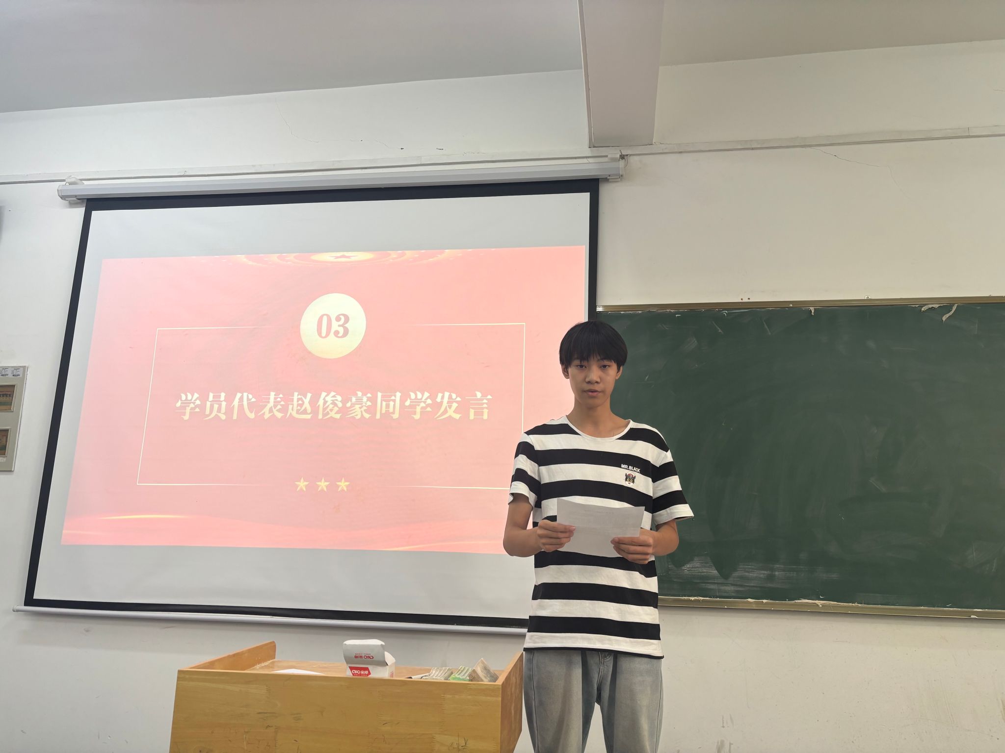 学员代表赵俊豪做表态发言,作为积极分子,我们要珍惜学习机会,认真学习,积极思考,不断提升自己,以实际行动向党组织靠拢,争取早日加入中国共产党,为实现中华民族伟大复兴的中国梦而努力奋斗!