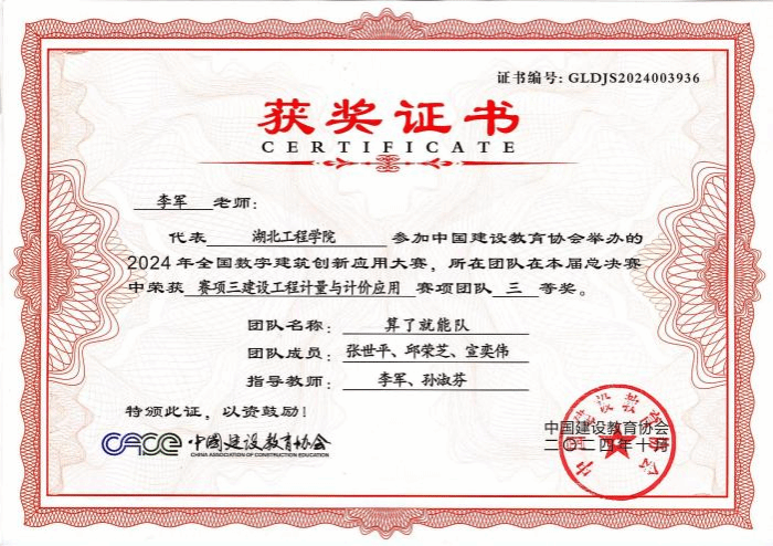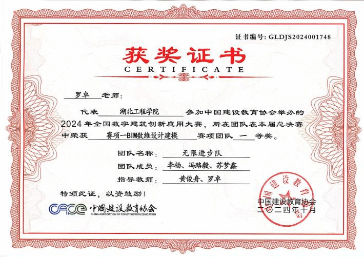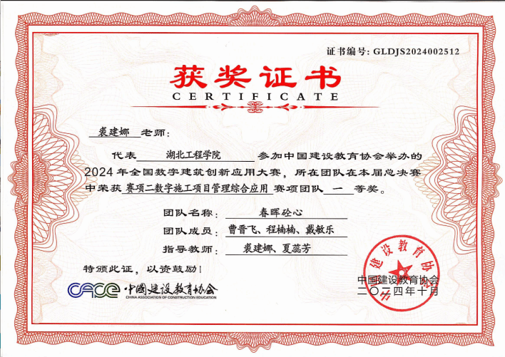 本次比赛在院领导的高度重视和大力支持下,上学期就开始布置,暑期开始训练,在黄俊舟、罗卓、裘建娜、夏蕊芳、李军、孙淑芬、郭波、胡坚等老师的悉心指导下,历经数月的精心准备和不懈努力,大家克服酷暑炎热,扎实地学与练、拼搏到底不言弃,经过全国海选赛,最终有四支队伍脱颖而出了进入全国总决赛。决赛中,同学们发挥了各自的专业优势,发挥了团队协作精神,最终在“BIM数维设计建模”赛项中获得一等奖1项,三等奖1项;在“数字施工项目管理综合应用”赛项中获得一等奖1项;在“建设工程计量与计价应用”赛项中获得三等奖1项。