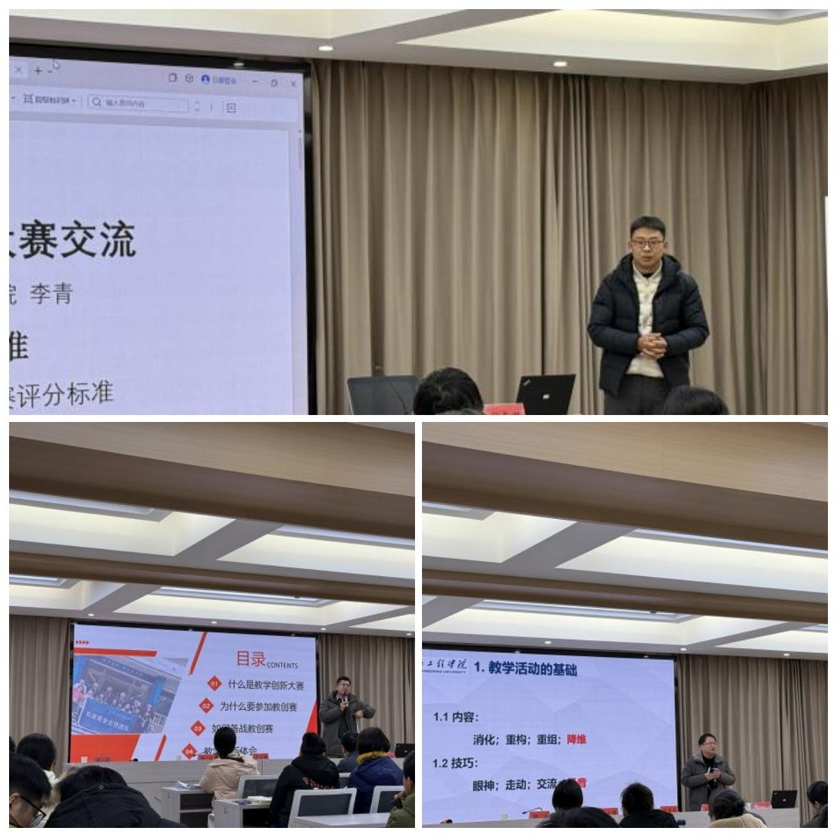 教务处副处长屈小静对三位教师的精彩分享给予了高度评价,对学校大赛组织情况进行了说明,并对第五届教师教学创新大赛相关工作进行了部署。屈处长提出三点建议:一是吃透比赛要点精髓,学习大赛实战经验,认真研读评分标准,认真备赛,赛出水平,充分展示教学成果;二是秉持“以赛促教”的理念,以比赛为契机,多维度、深层次去思考和提升教育教学能力;三是希望教创赛能够成为学校本科教育教学创新示范标杆,充分发挥教创赛辐射效应和引领示范作用,带动更多的教师聚焦教学创新工作,不断提升教学水平。她还强调,学校高度重视此次活动,呼吁教师们以此为契机,不断激发课堂教学创新活力,提升自身教学能力,推进教学方法和手段的改革创新,为学校培养高素质人才贡献力量。