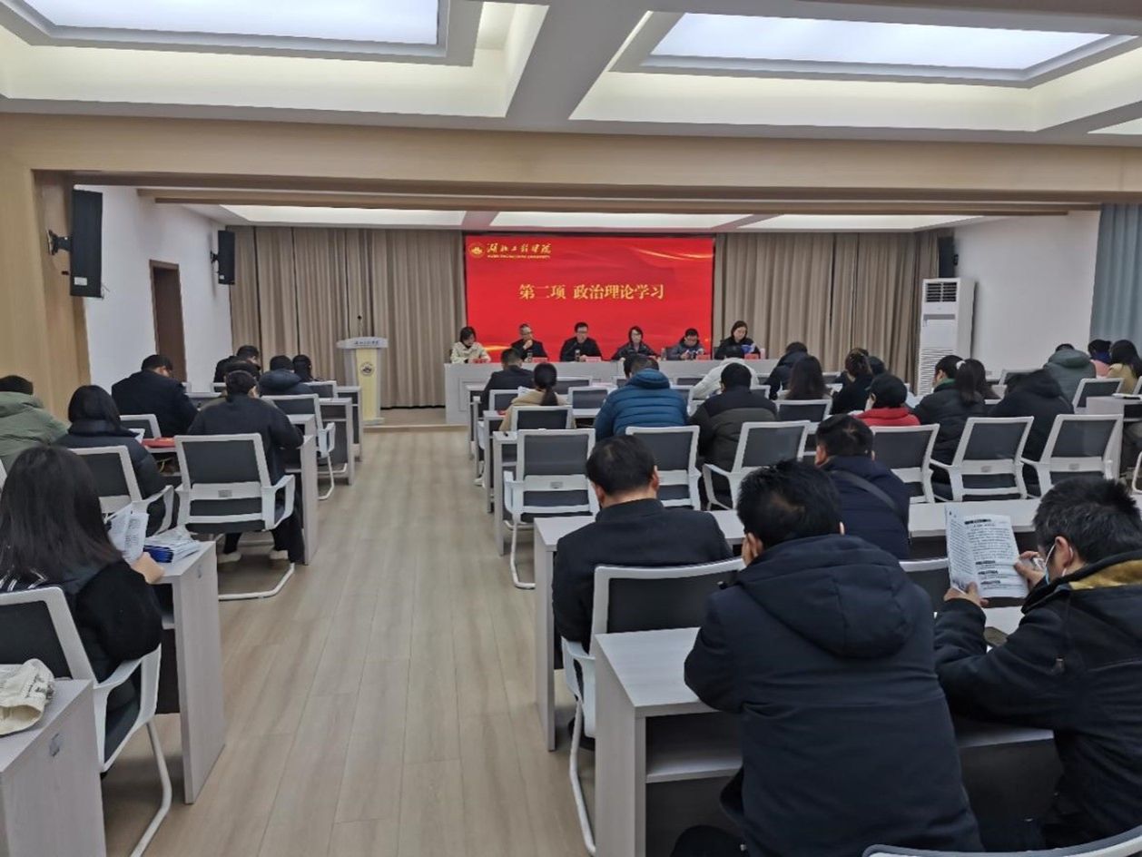 随后,会议开展了教职工政治理论学习。会议集中传达和学习了《本科教育教学审核评估应知应会手册》(教职工版)、《威廉中国官方本科教育教学审核评估自评报告》等审核评估有关内容,党委书记朱正丰结合学院具体工作,会议传达学习了2025年春季学期中层正职干部会暨本科专业监测评估启动会和2025年学校全面从严治党工作会议精神。