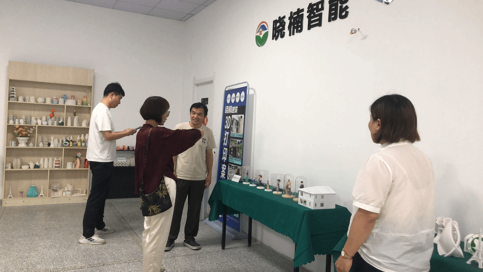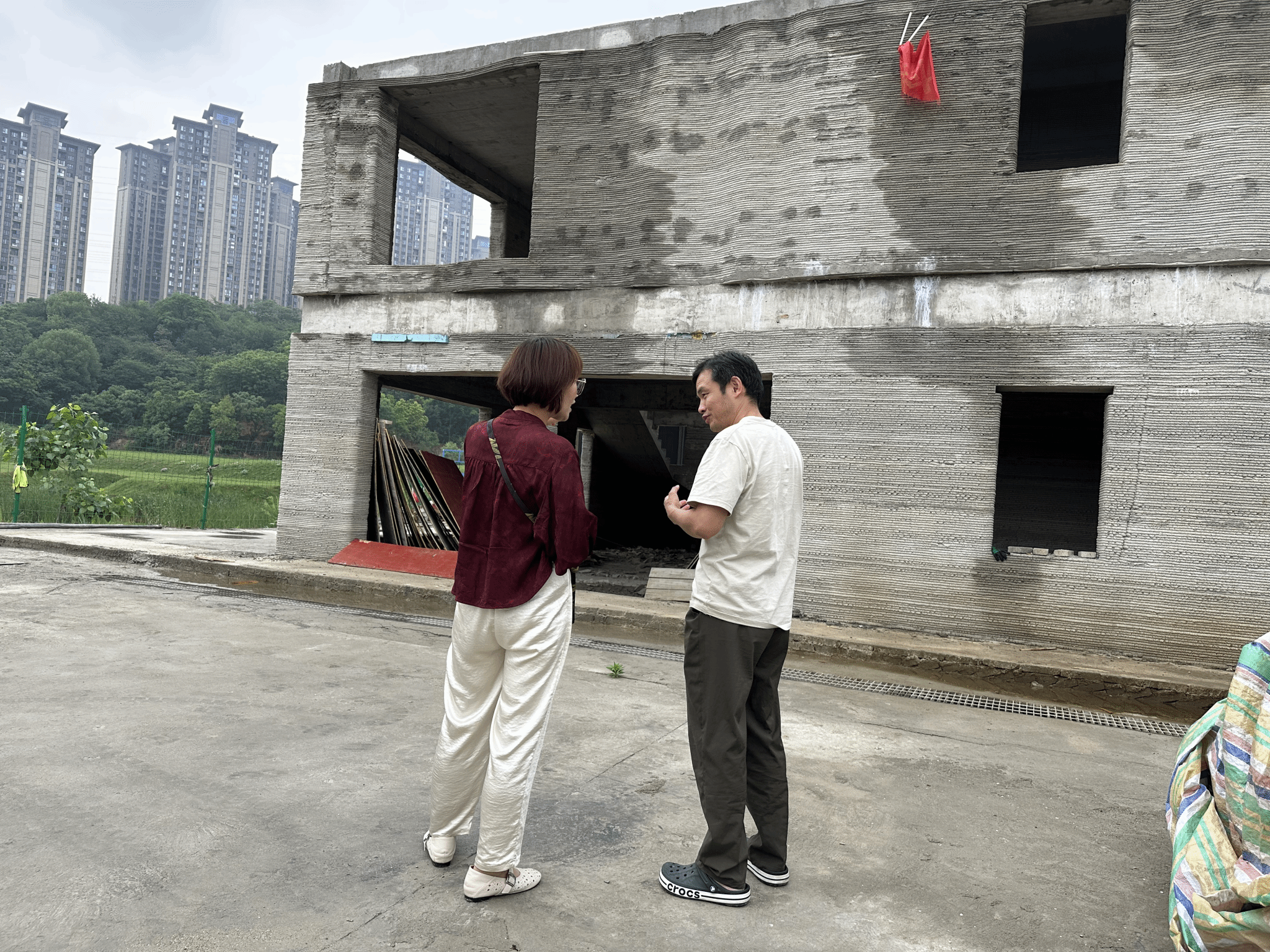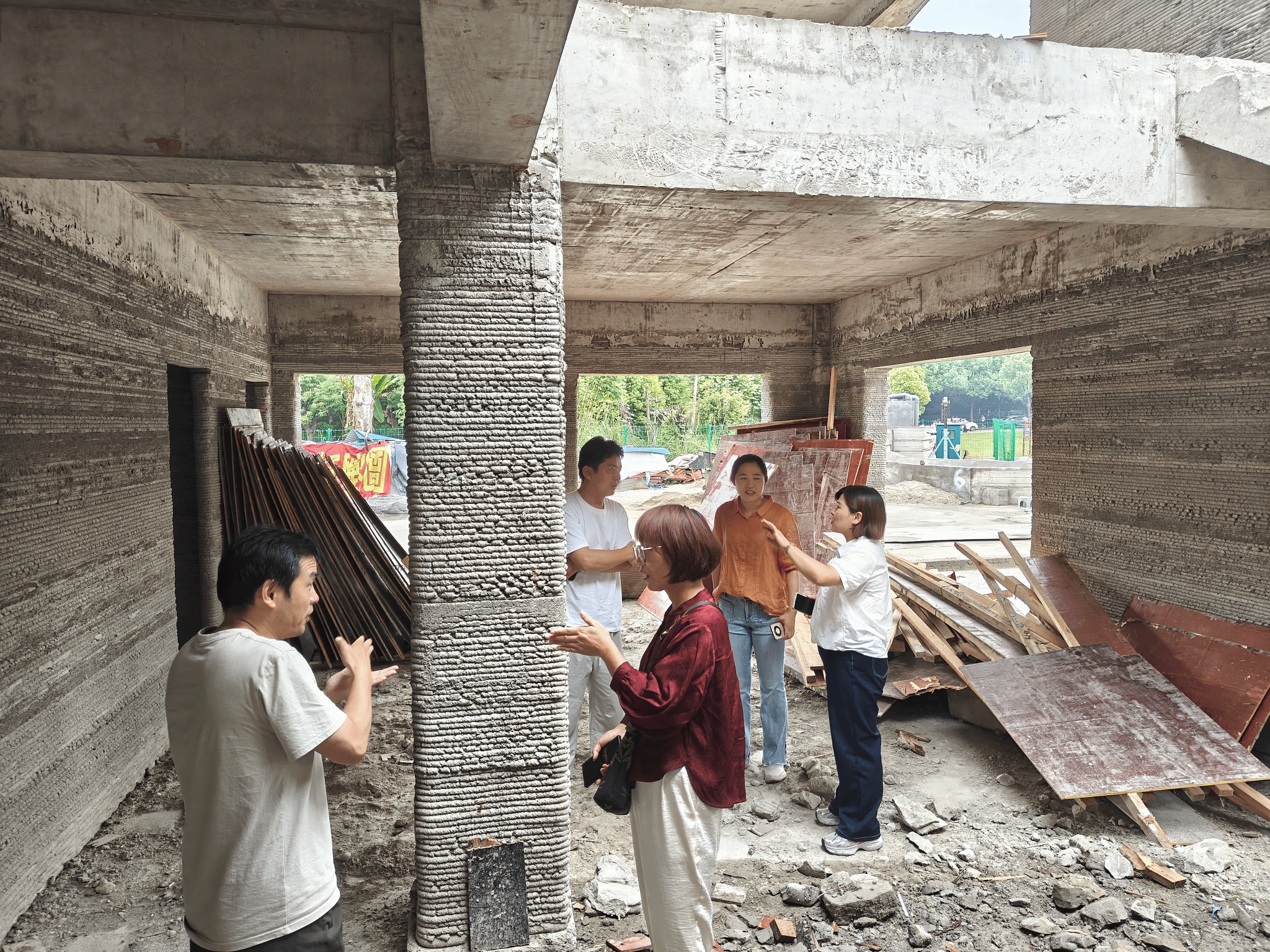 路亚妮院长一行在晓楠智能科技有限公司负责人李洋波教授的陪同下,首先参观了三峡大学3D打印研发基地试验场,实地观摩了由其自行研发的12米级龙门式建筑3D打印机建设的双层小楼,团队成员近距离观察房屋的建造工艺、材料运用和整体质量,对3D建筑打印技术在实际建筑项目中的应用有了更直观、深入的认识。