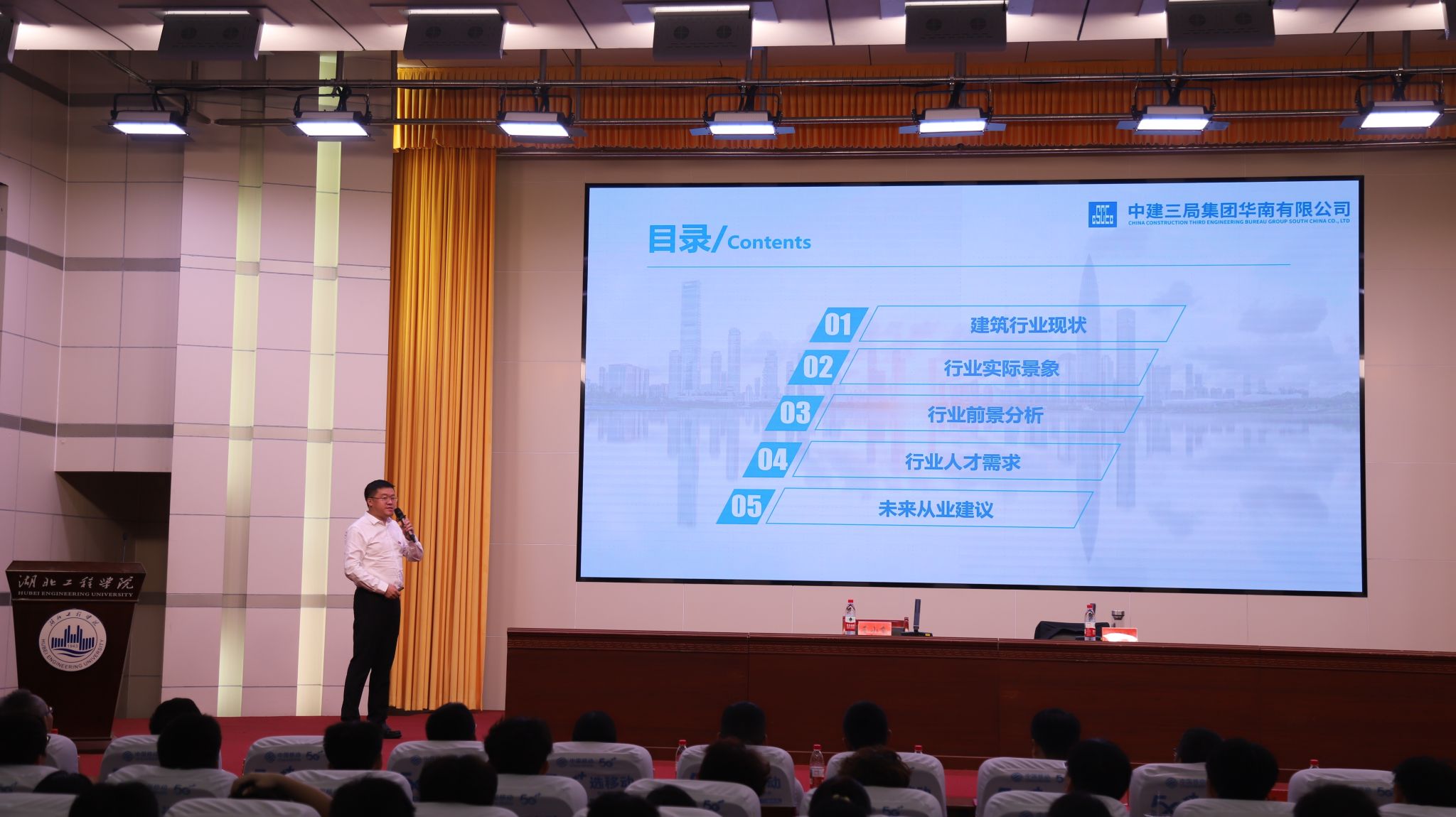 我院2002级校友、中建三局华南公司副总经理王小飞从建筑行业现状、实际景象、前景分析、人才需求及从业建议五个方面,为在场师生带来了一场精彩报告。报告内容既包含丰富的一线实践案例,又展现出开阔的国际视野,句句干货、字字恳切。他以自身从技术员成长为高管的经历,生动诠释了“厚土扎根、众木成梁”的土木精神,为同学们未来的学习与职业发展指明了方向。