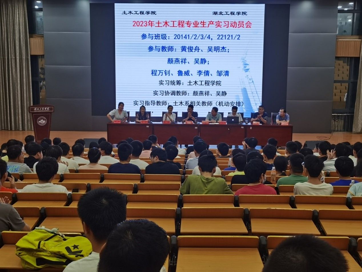 2023年6月19日晚在天成楼315报告厅,土木工程系召开土木工程专业生产实习动员大会。工程实践和社会服务专家、优秀教师代表黄俊舟老师,建筑学系主任吴明杰,土木系支部书记吴静,土木系主任颜燕祥,土木系大三年级班主任鲁威老师、李倩老师、程万钊老师、邹清老师及各实习班学生221人参加此次大会,会议由土木系支部书记吴静主持。