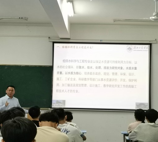 祝成成主任从本专业“是什么、学什么、干什么”三个方面出发,详细介绍了给排水科学与工程专业的未来前景、培养方案及就业方向。他强调大学教育已进入“新时代”,对大学生全面发展的要求也越来越高,同学们必须努力学习才能为未来发展奠定坚实基础。