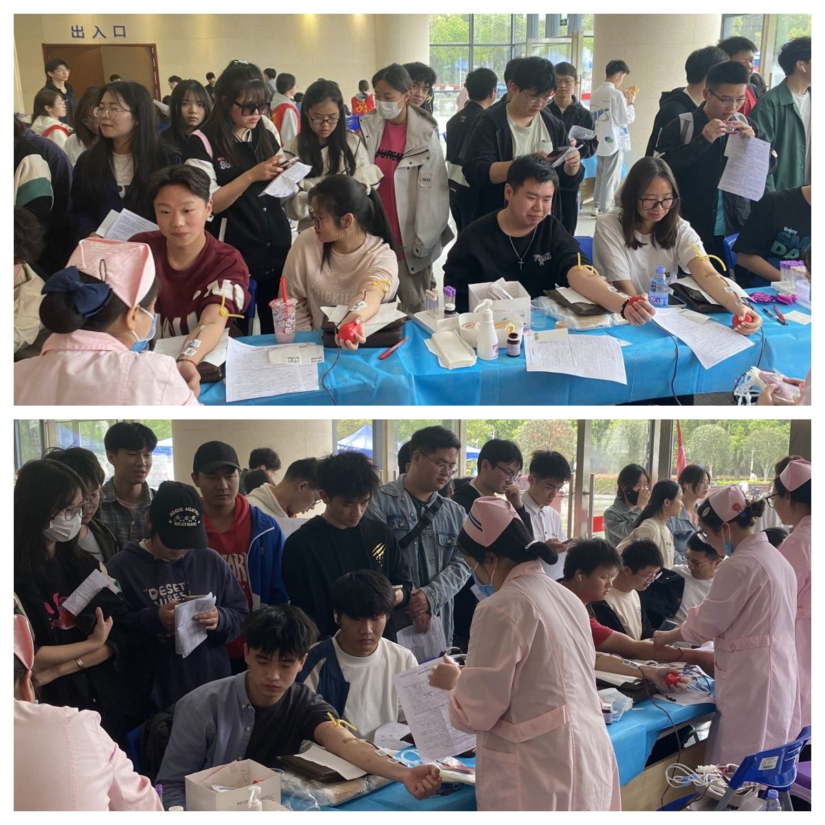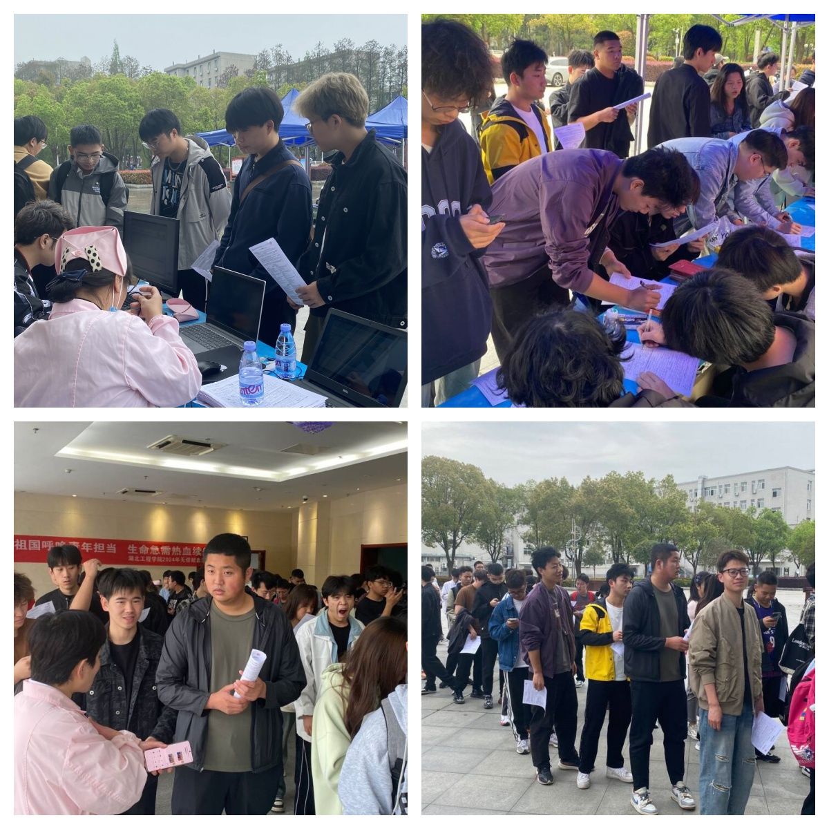 在活动开始前,一支由退役士兵组成的领航队和由学生党员、学生干部、考研学子、团员青年组成的“砼心筑梦”小分队格外闪耀,他们早早来到献血处等待,采集登记处很快排起了一条长龙。在志愿者和工作人员的协助下,献血的同学们井然有序地填写了基本信息表格、体检、化验……依次排队等待献血,献出自己的爱心,他们以青春之名,为生命续航。