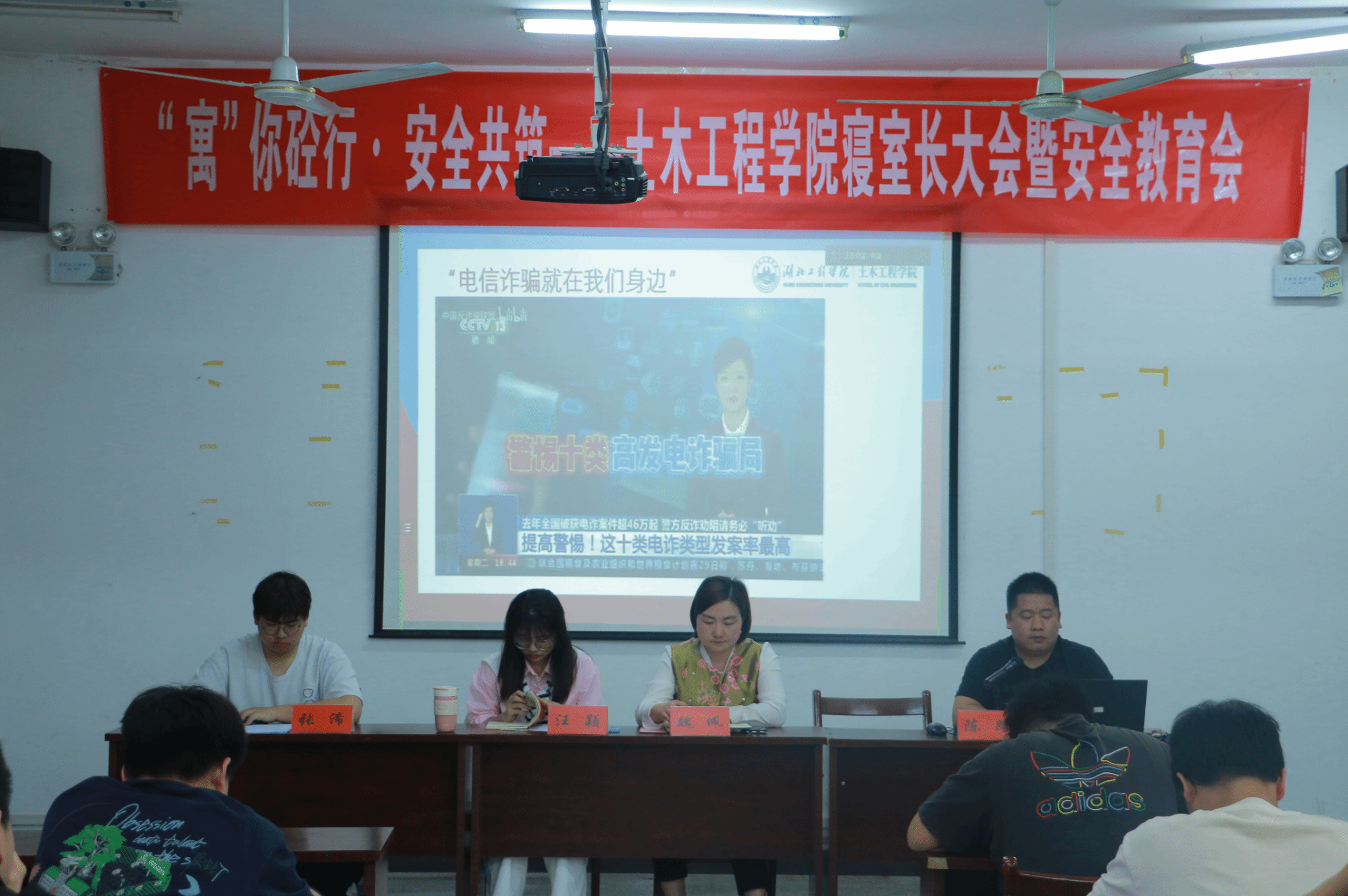 辅导员陈老师从寝室安全、寝室卫生、寝室和睦相处三个方面展开,提醒寝室长要严格遵守寝室相关规定,按要求加强寝室内务管理,不私改电源,不使用违章电器,对飞线充电、饲养宠物、拒不开门等行为“零”容忍。同时也就寝室成员预防电信诈骗进行了专题讲解,以学院学生亲身遭遇的案例,现身说法,进一步夯实寝室成员的防范意识。