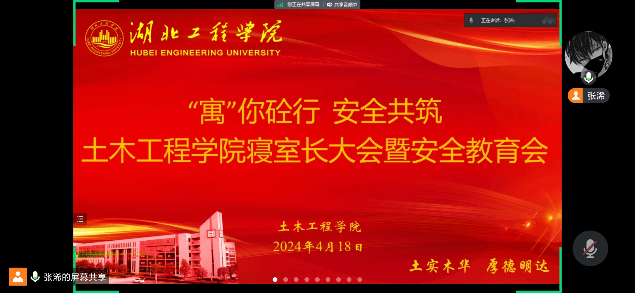 为进一步增强学生的安全意识,强化学院寝室管理工作,形成文明和谐的寝室环境,我院于4月18日在天工楼504召开“寓”你砼行 安全共筑——寝室长大会暨安全教育会,会议线上线下同步进行。学院党委副书记魏佩,辅导员汪颖、陈路,学院寝管会干部和全院寝室长参加,会议由辅导员陈老师主持。