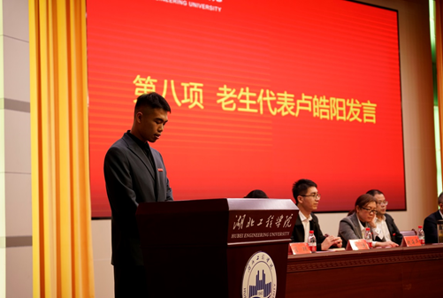 在校生代表卢皓阳提醒大家珍惜大学生活,珍惜每一次学习的机会,希望同学们担起肩上的责任,继承并发扬工匠精神,争做合格土木人。