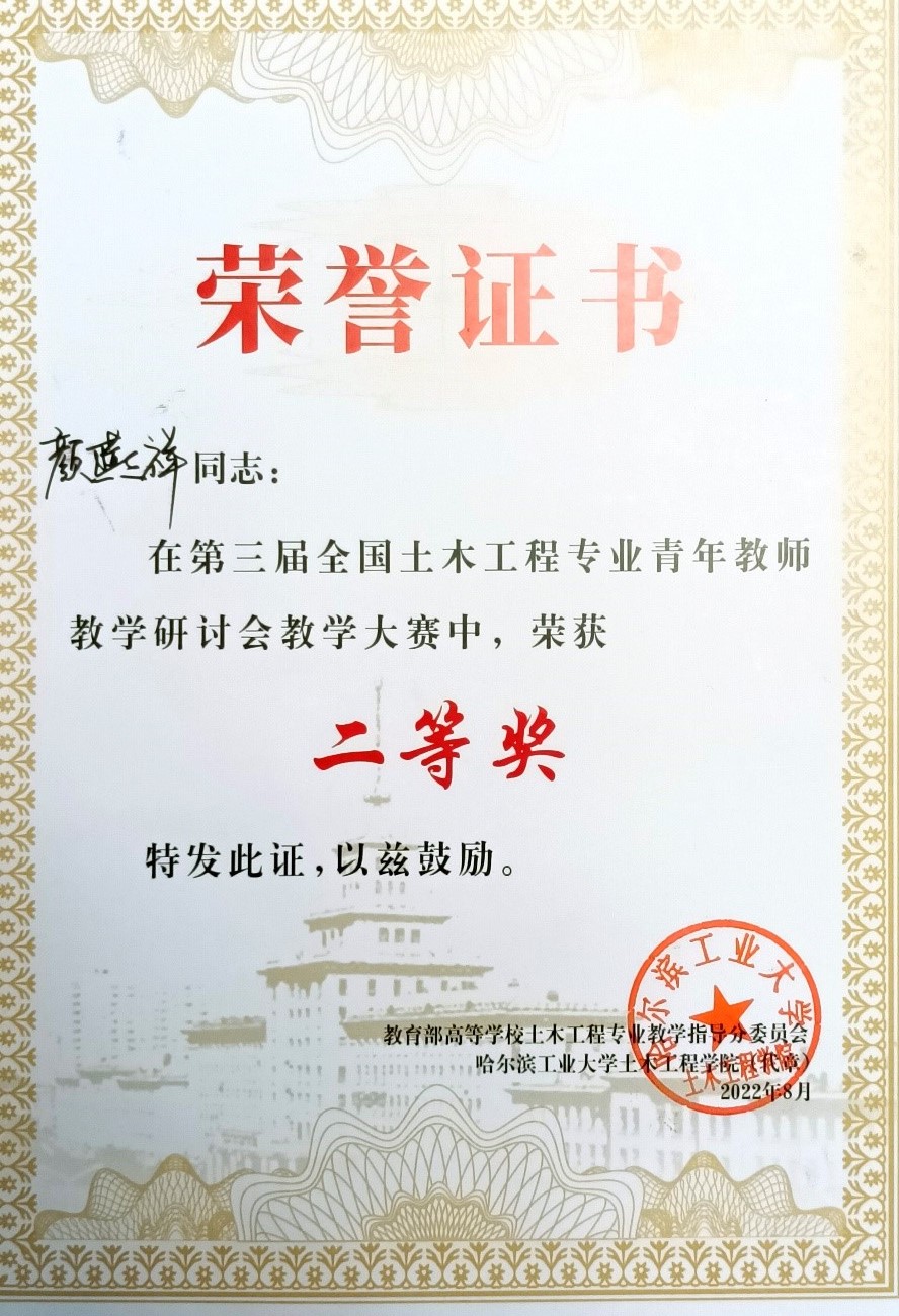 教学大赛吸引了上海交通大学、东南大学、华中科技大学、哈尔滨工业大学、重庆大学、西南交通大学等50余所高校的土木工程专业青年教师参赛。我院教师颜燕祥从学校办学定位及人才培养方案和学科特点出发,深入挖掘教学内容与工程实践结合的内涵,巧妙地融入课程思政,体现了教学设计的高阶性和创新性,展现出优秀的教学功底和扎实的专业基础,得到了专家的认可和好评,最终斩获二等奖。