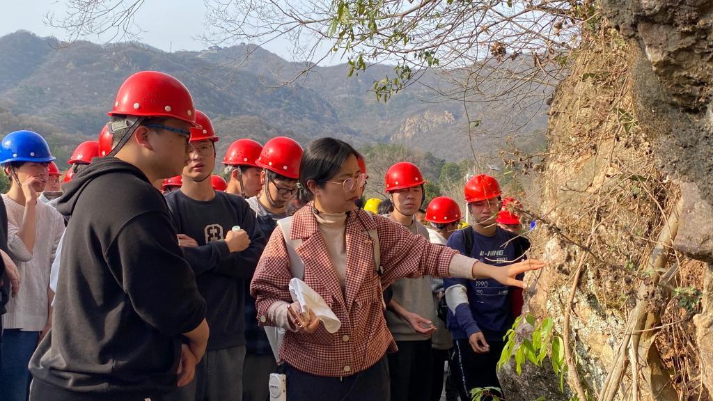 3月6日,在大洪山“剑口”地质带幽静崎岖的山谷里,指导老师们为学生详细讲解了该区域的地形地貌、地质结构及其砂土性质。通过实地“察、摸、闻、测”,学生们学习掌握了分析岩层和地质特点的方法,考证了此区域上部为中厚层砂岩,下部为巨厚层立岩并与地下河相连通,且该地层与下覆地层存在典型的不整合,接触面属于角度不整合接触的结论。