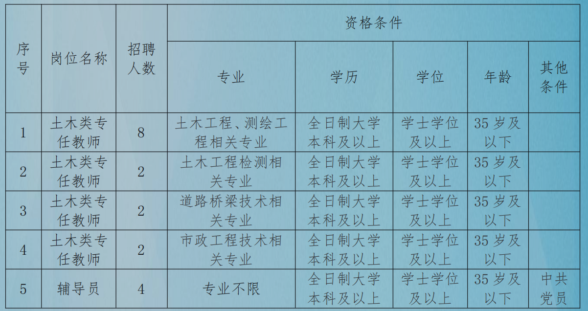 土木工程(建筑材料)学院是我校办学规模最大、师资力量最强、就业形势最好的二级学院,开设建筑工程技术、工程造价、工程测量技术、建设工程管理、道路桥梁工程技术、土木工程检测技术、装配式建筑构件智能化制造技术、建设工程监理、材料工程技术、市政工程技术等 10 个专业。学院以培养建筑领域“擅识图、懂技术、会管理”的技术技能型人才为目标,拥有区内一流的 BIM 工程中心,实训场所面积 1.2 万平方米,实训工位 1500 个,设备总值 2500 余万元。拥有校外实习基地 46 家,为提升学生的专业素养和职业能力提供了强有力的保障。实现校企深度融合,共同培养企业“适用”人才。近三年学生参加国家、区级技能比赛共获奖 150多项,获奖数量和等级处于区内领先地位。为了满足教学管理工作需要,现面向社会公开招聘专任教师和辅导员。