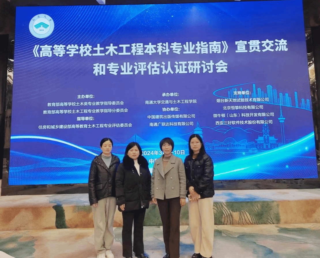 3月9日-10日,我院院长路亚妮携专业认证工作小组骨干成员韩燕华、吴静、肖聪一行四人赴南通大学参加《高等学校土木工程本科专业指南》宣贯交流和专业评估认证研讨会。南通大学党委副书记、校长杨宇民,教育部高等学校土木工程专业教学指导分委员会主任委员孙利民,住房和城乡建设部高等教育土木工程专业评估委员会主任委员、同济大学原常务副校长陈以一,中国建筑工业出版社副总编辑、教育教材分社社长胡永旭等出席开幕式。来自全国150余所高校的400余名土木专业专家学者齐聚一堂,共同探讨土木工程专业建设和人才培养的实践与创新。
