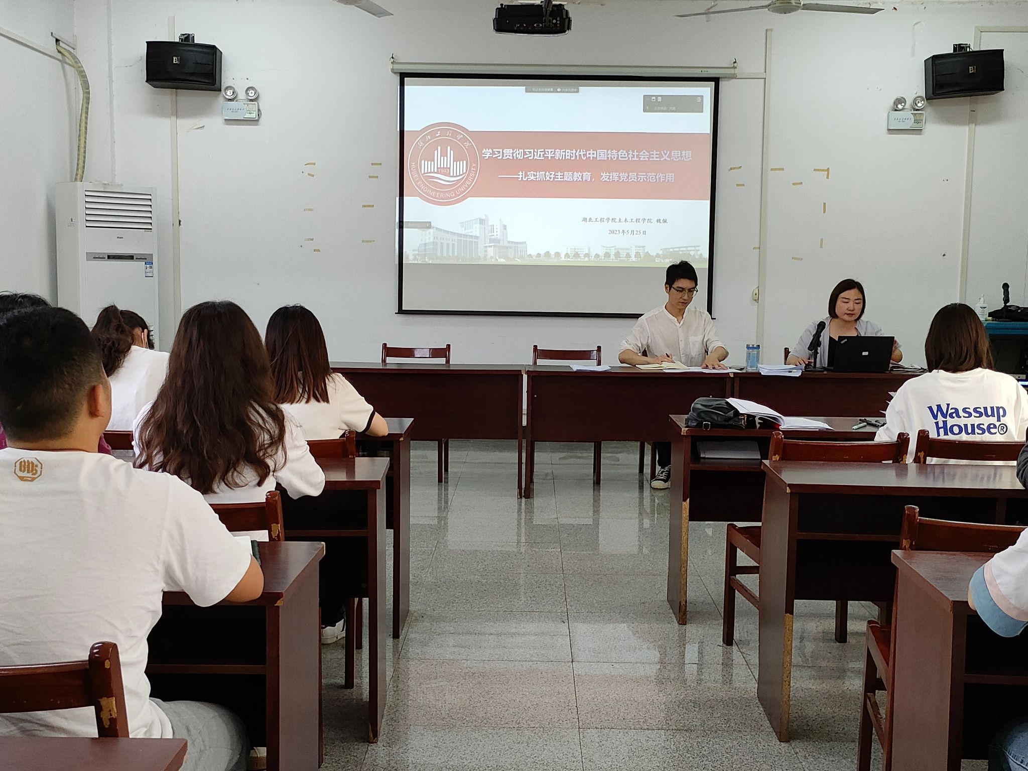魏佩首先以“学习贯彻习近平新时代中国特色社会主义思想——扎实抓好主题教育,发挥党员示范作用”为题讲授专题党课。她主要从开展主题教育的根本遵循、习近平新时代中国特色社会主义思想的科学体系等两个方面对习近平新时代中国特色社会主义思想进行解读,并结合工作实际,坚持问题导向,就如何发挥学生党员在学生成长成才和学生自我管理等方面的示范作用进行了深入分析。