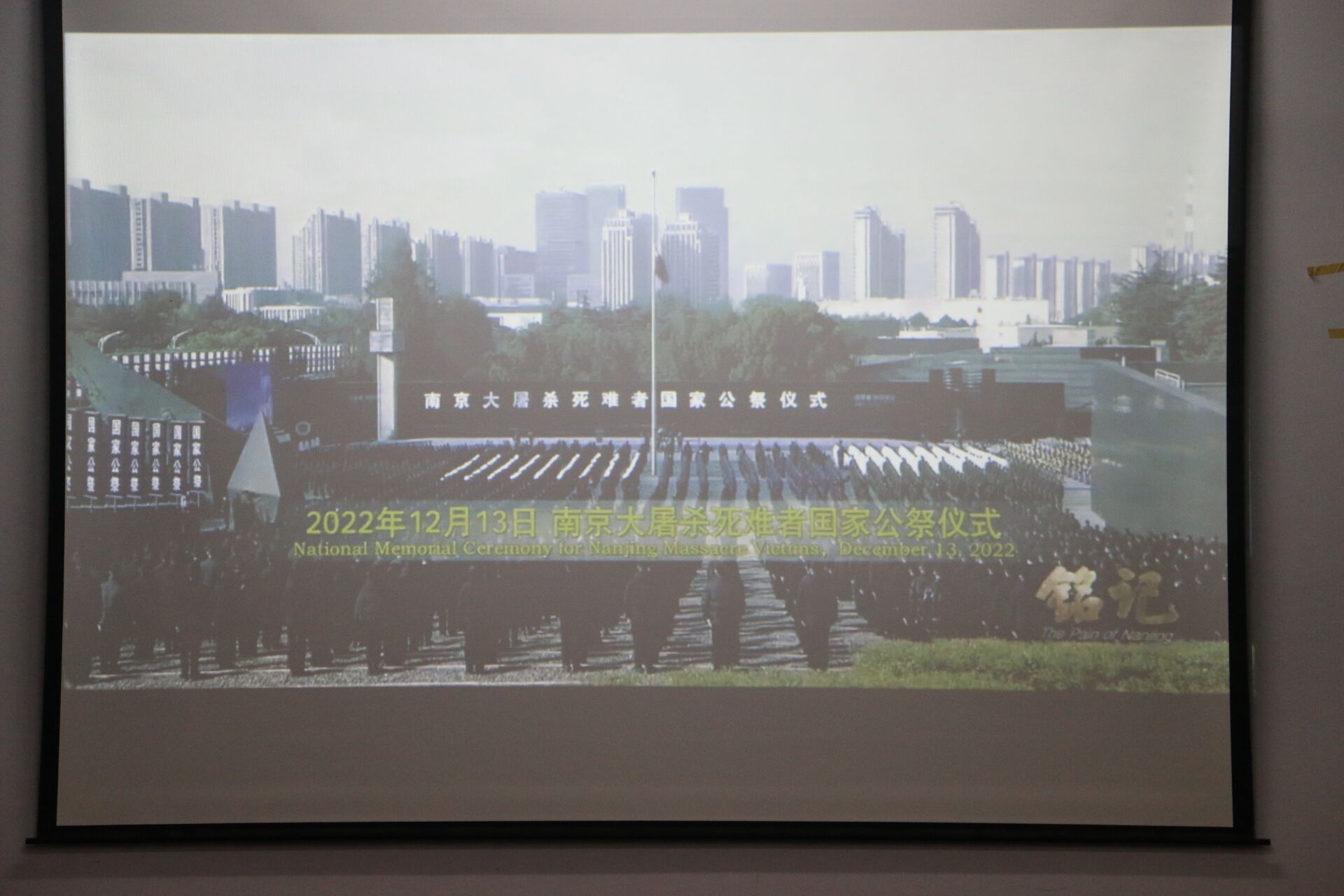活动伊始,院青协办公室成员宋子成讲解“南京大屠杀”PPT内容,现场沉重严肃,南京大屠杀是所有国人心中不可痊愈的伤疤。