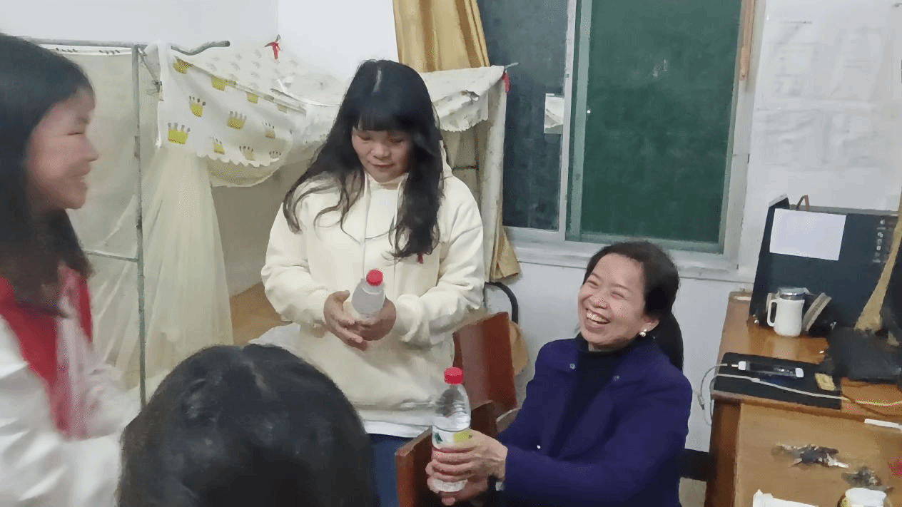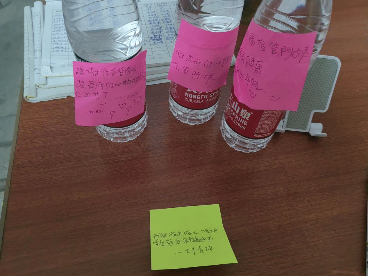 在活动中志愿者们陆续走访每一栋楼的宿管阿姨,在阿姨疲惫之余,给宿管阿姨送上感恩和祝福。“谢谢”是志愿者们和阿姨之间重复最多的话,志愿者们感谢阿姨为宿舍做出的贡献,阿姨们感谢志愿者们送来的水。感谢阿姨对我们宿舍的上心、对我们的关照,让我们在他乡也能感受到家的温暖。志愿者们在递完水后也同宿管阿姨们聊天交心,晚上宿管间里是志愿者和宿管阿姨谈心的笑声。阿姨说:“太感动了,我都舍不得喝,没想到会有小朋友们来送温暖,工作能得到学生们的尊重和感激,心里呀甜滋滋的。”