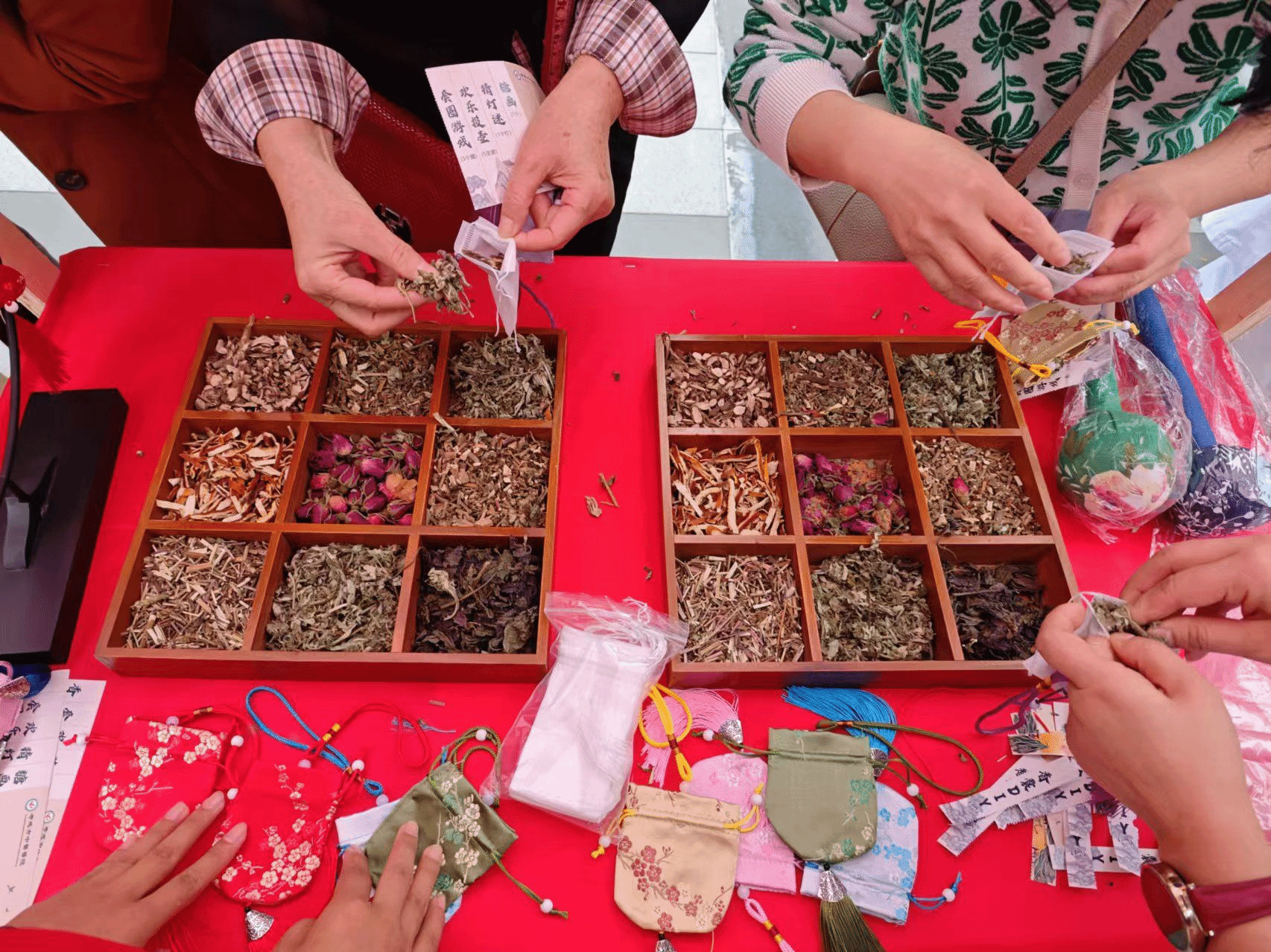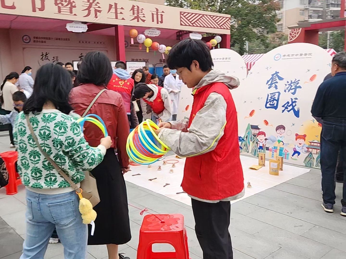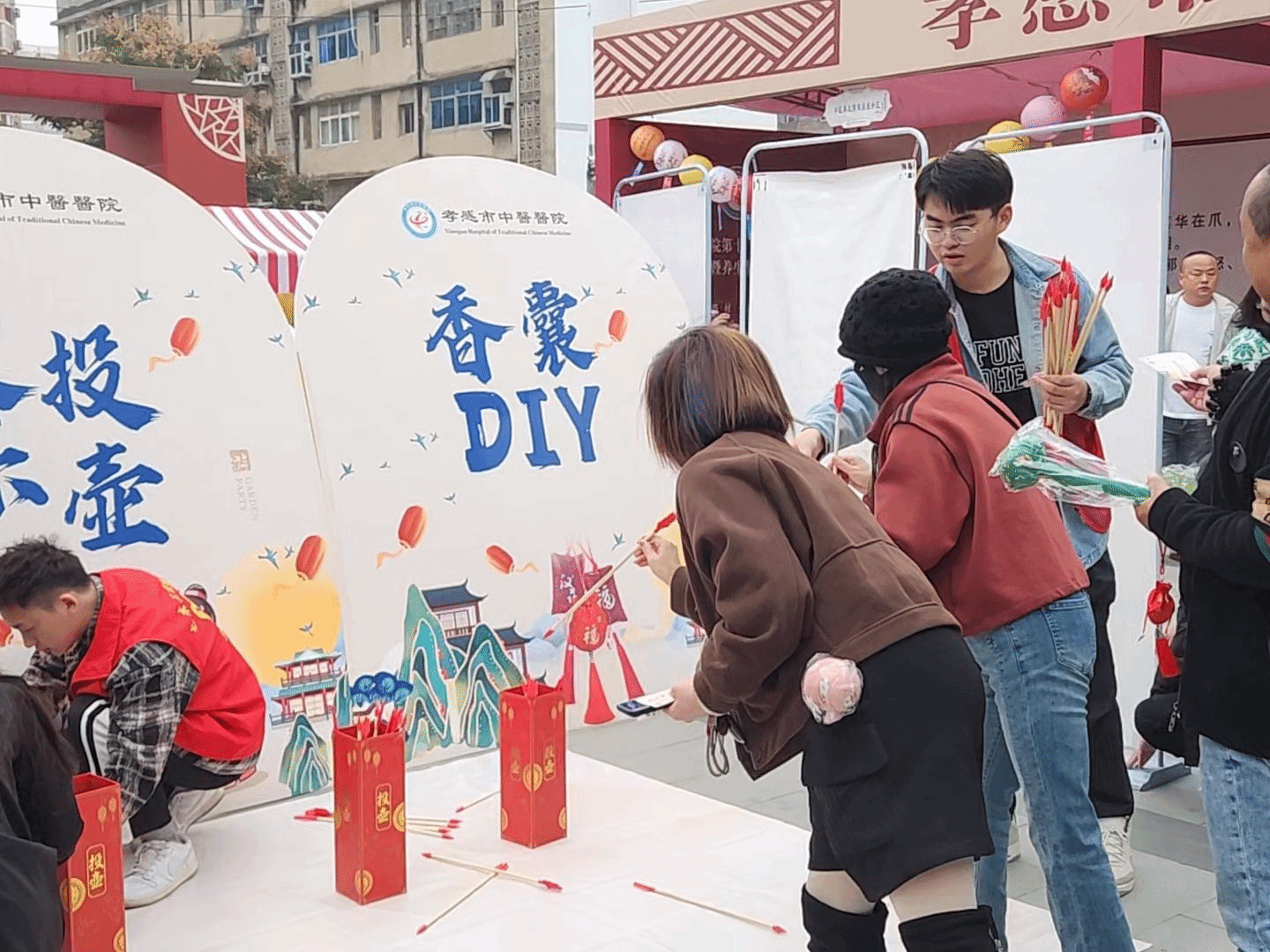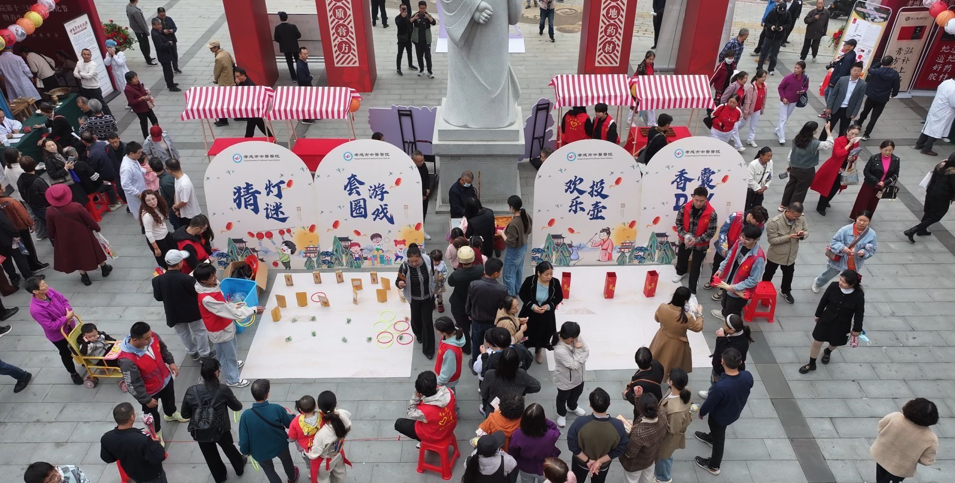 活动现场人声鼎沸,热闹非凡。广场设立了多个互动体验区,包括中医外治疗法体验、中药炮制展览、名贵中药材展示、膏方熬制展示、中药茶饮品尝、中医养生八段锦、健康咨询等。青协志愿者们协助开展香囊DIY、投壶游戏、糖画等项目现场秩序维护和引导服务。